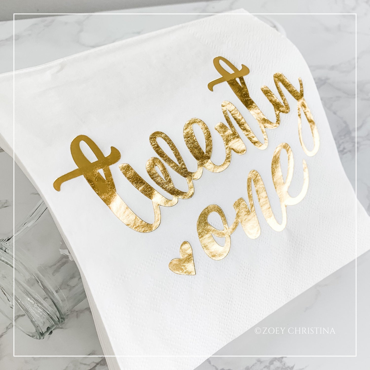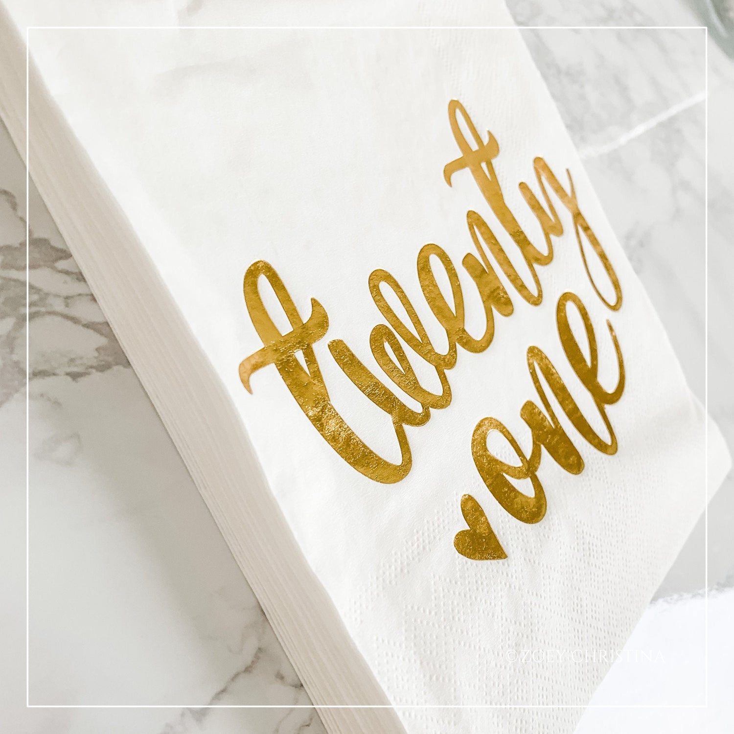 Make every 21st birthday celebration extra special with these elegant white dinner napkins featuring gold foil “Twenty One” lettering. Whether you're hosting a stylish cocktail party, a fun dinner gathering, or a night out with friends, these premium disposable napkins add the perfect touch of glam.