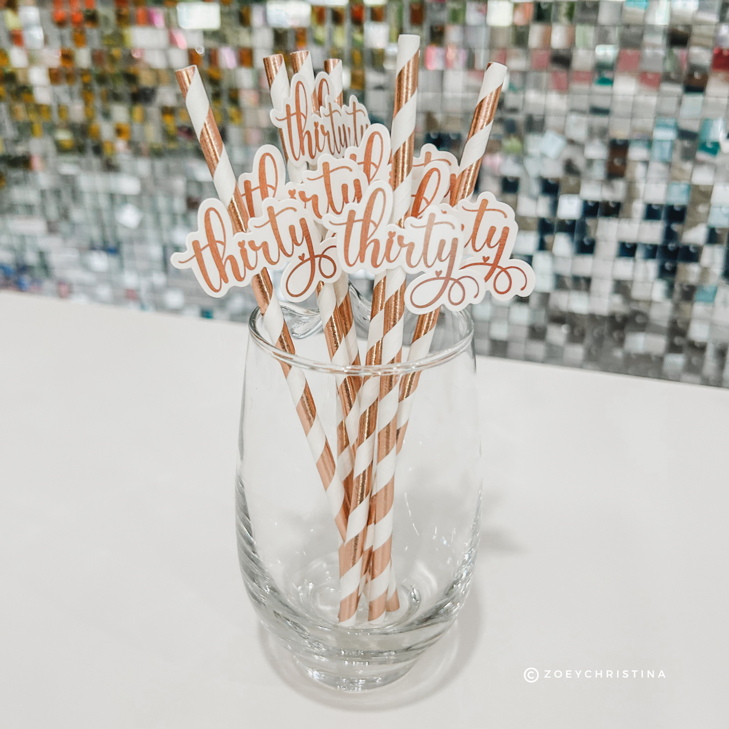 Gold & Rose Gold "Thirty" Paper Straws – 30th Milestone Party Supplies