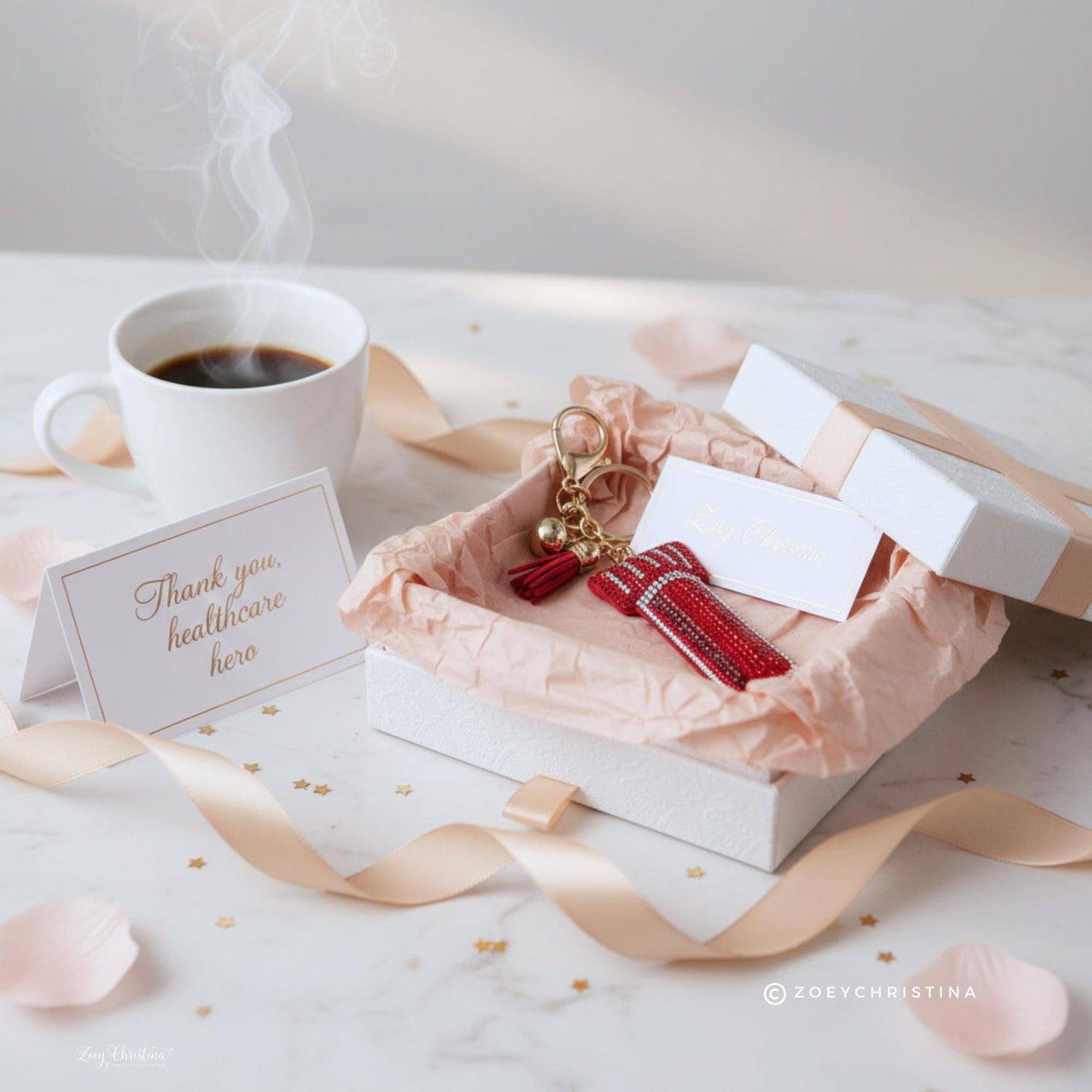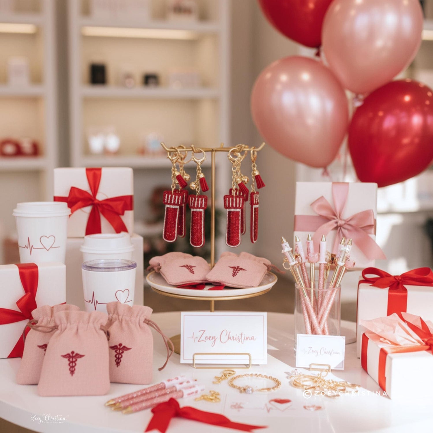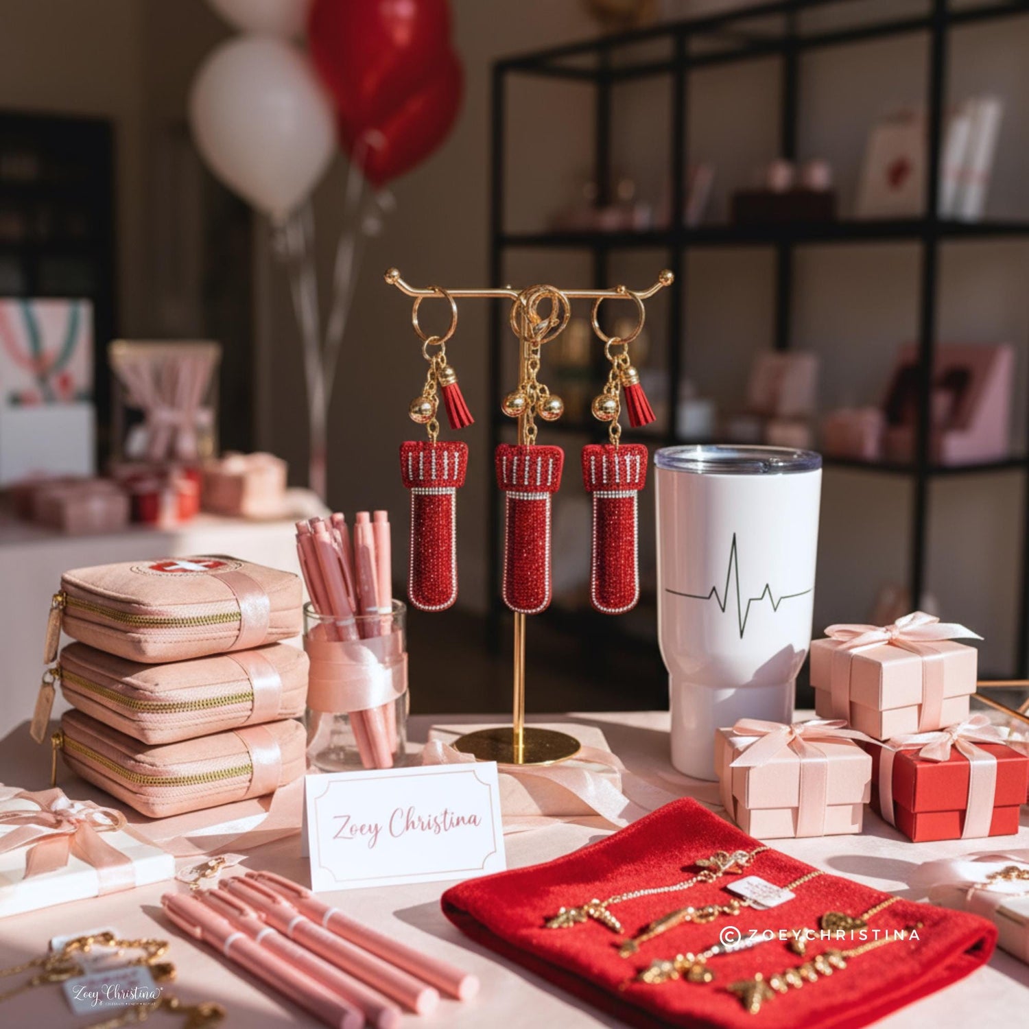 The red vial shape is encrusted with shimmering rhinestones and finished with a coordinating tassel and gold-tone hardware. Use it as a keychain, bag charm, or badge reel add-on. Whether you're drawing blood or just drawing compliments, this piece is made to shine.