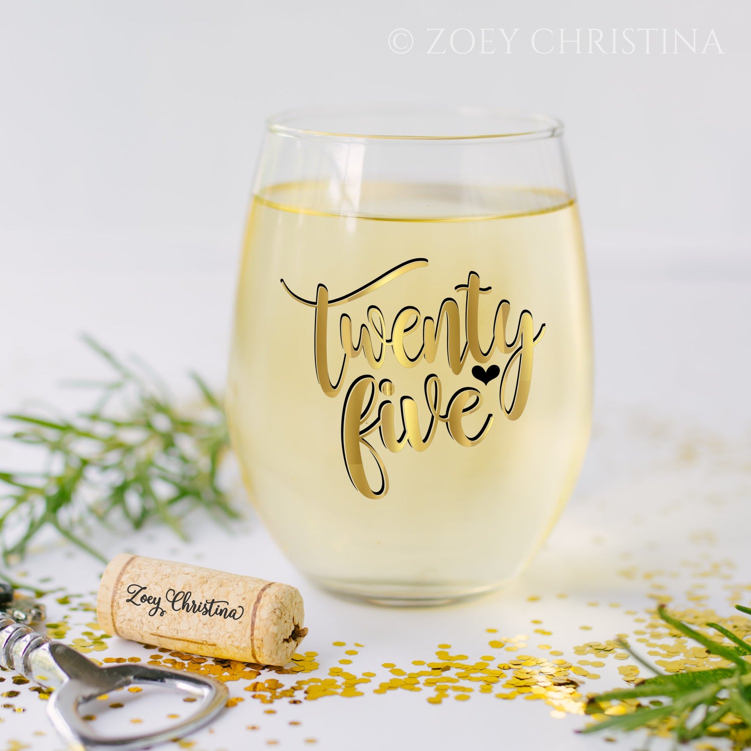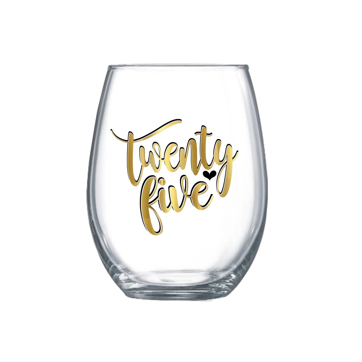 Celebrate turning 25 in style with our elegant “Twenty Five” stemless wine glass! Featuring a sleek gold script and a playful heart detail, this 18oz glass is perfect for sipping something special on your big day—or gifting to the fabulous 25-year-old in your life.