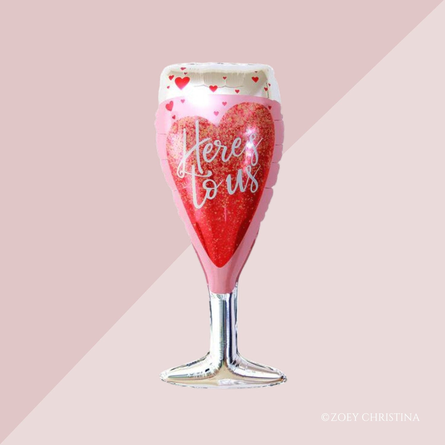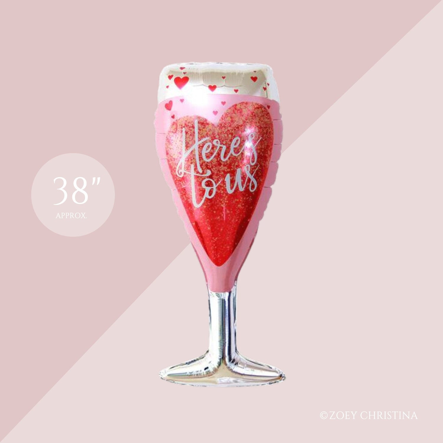 This 36" red champagne glass balloon is the perfect way to celebrate Valentine’s Day, anniversaries, proposals, and romantic evenings. Featuring "Here's to Us" in an elegant script, it makes a beautiful statement for couples, best friends, and celebrations of love!