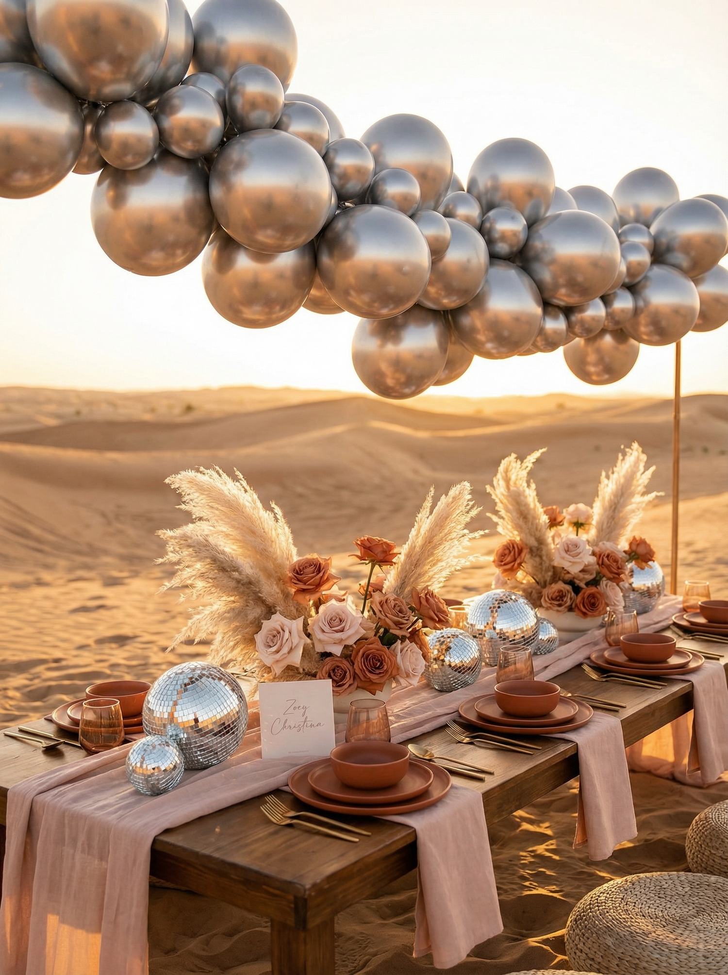 Perfect for Scottsdale bachelorette parties, desert-boho celebrations, birthdays, bridal showers, and any event where you want a little shimmer and a whole lot of wow. This elevated neutral palette pairs beautifully with rattan, pampas, desert florals, and champagne tones.
