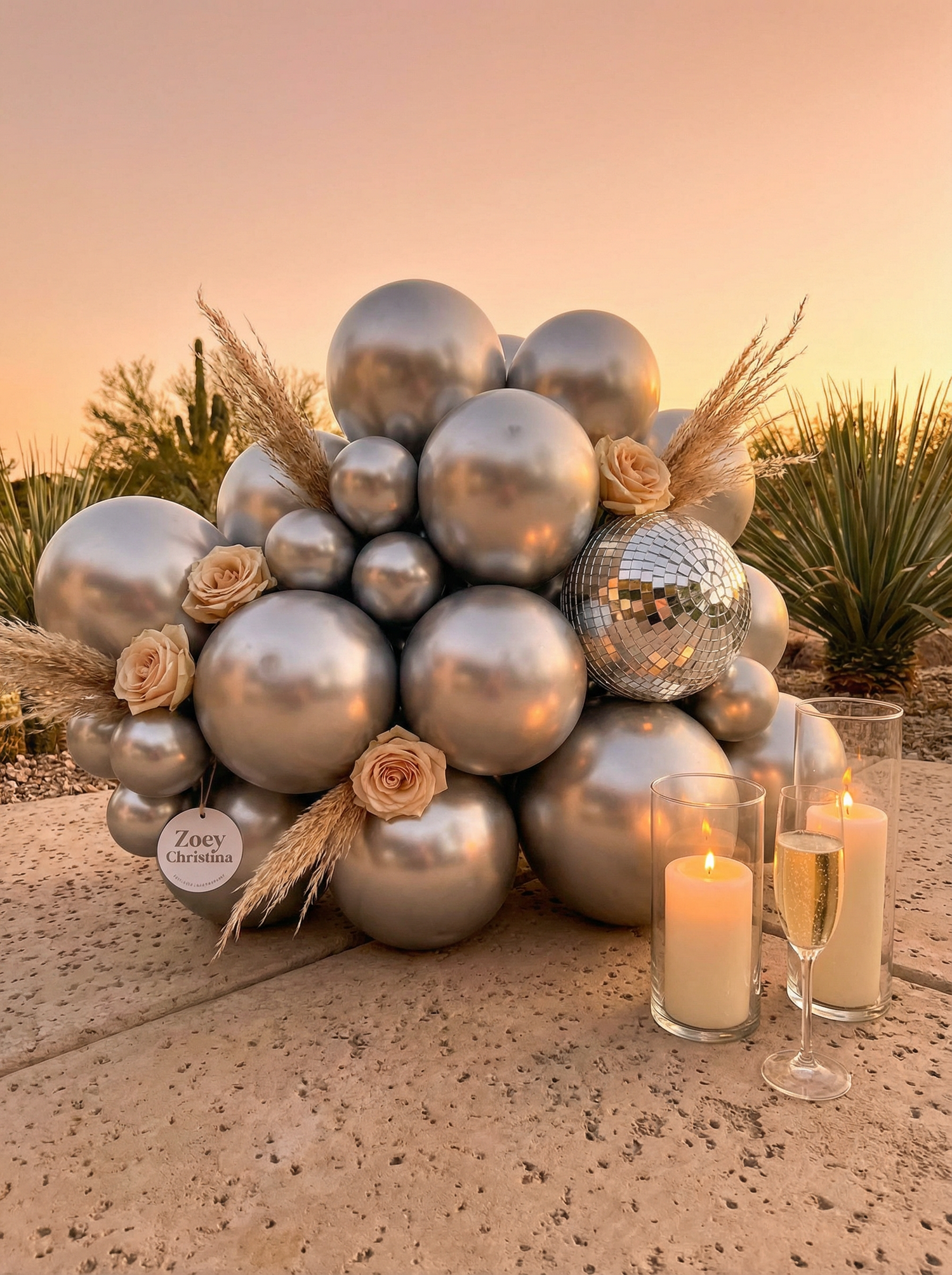 Bring the iconic Desert Disco aesthetic to life with our luxe Silver Mirrorball Balloon Garland — a stunning mix of metallic silver balloons in multiple sizes, styled with sparkly mirrorball accents for a high-end, modern party look.