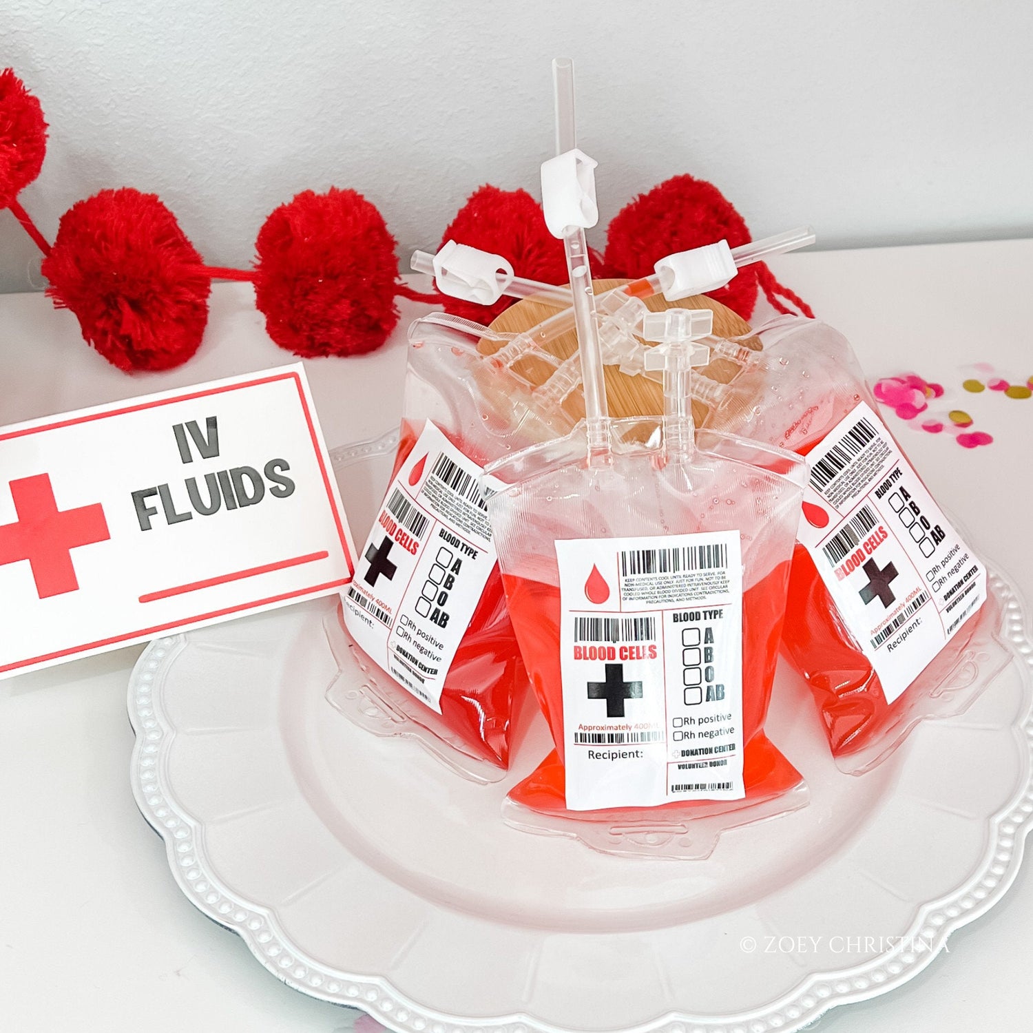 ✔️ 10-Pack of Refillable IV Drink Pouches – Realistic blood bag design for medical, horror, or nurse parties.