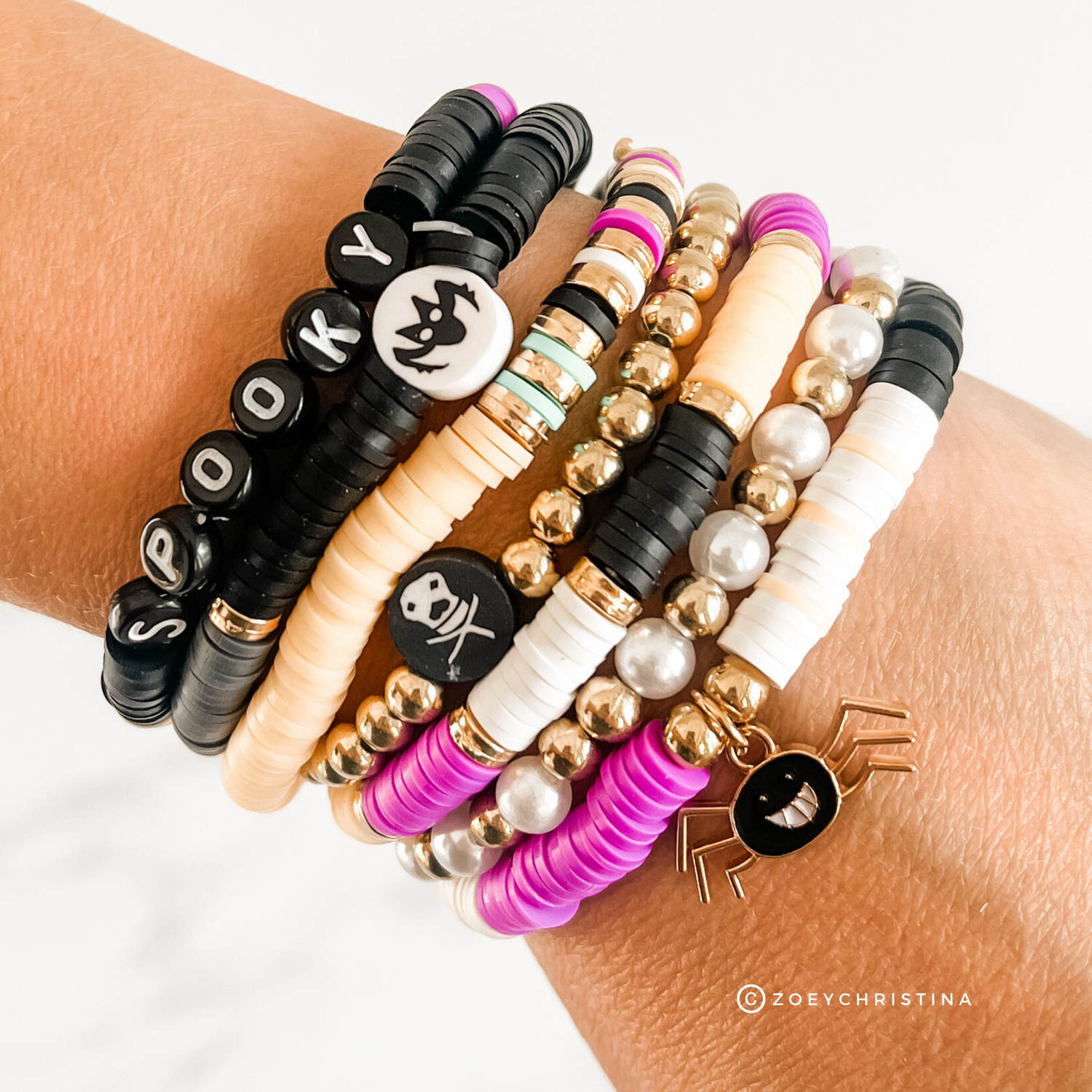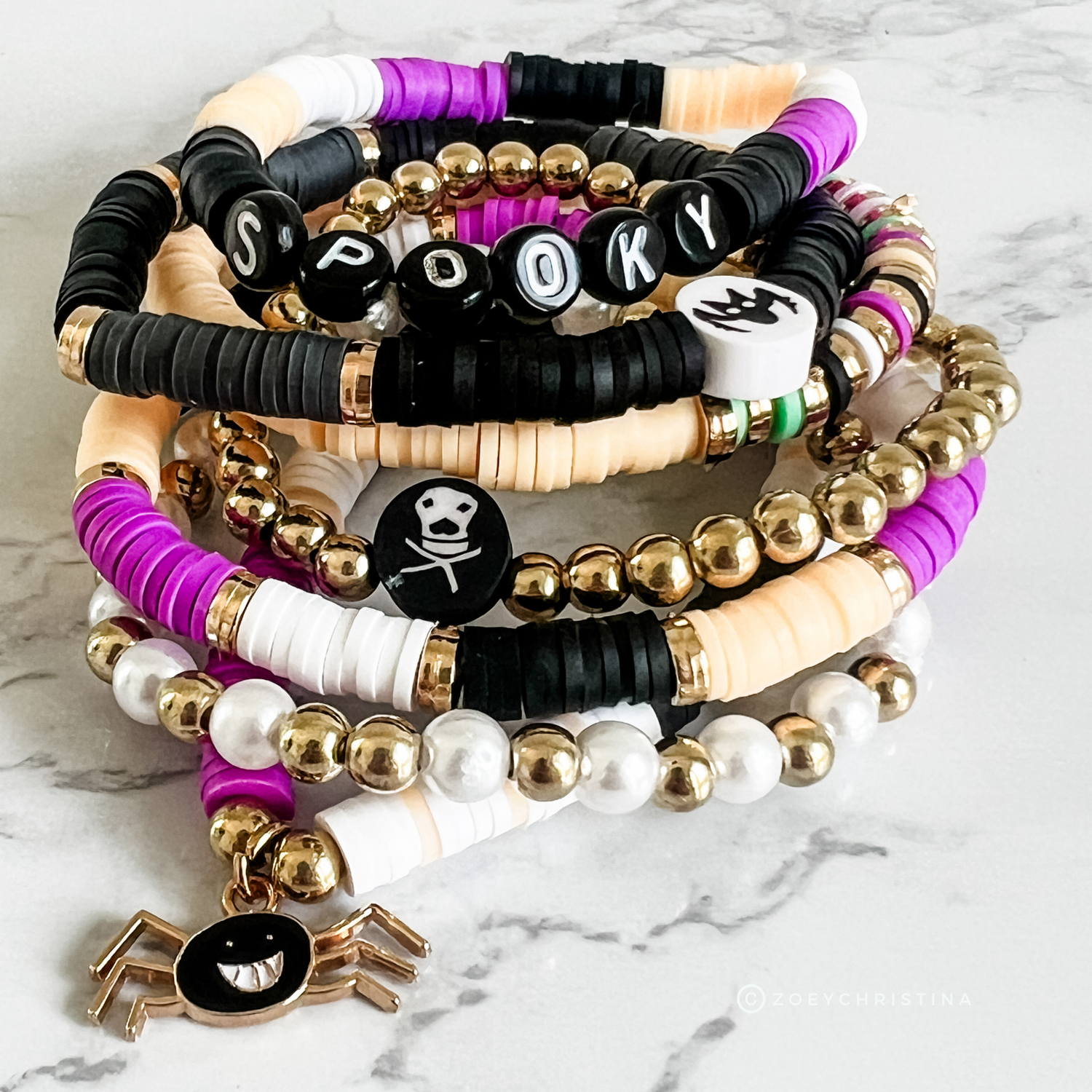 Spooky Halloween Stacking Bracelet Set – Heishi Beads, Gold Accents, Skull & Spider Charms – Halloween Arm Candy, Beaded Stretch Bracelets